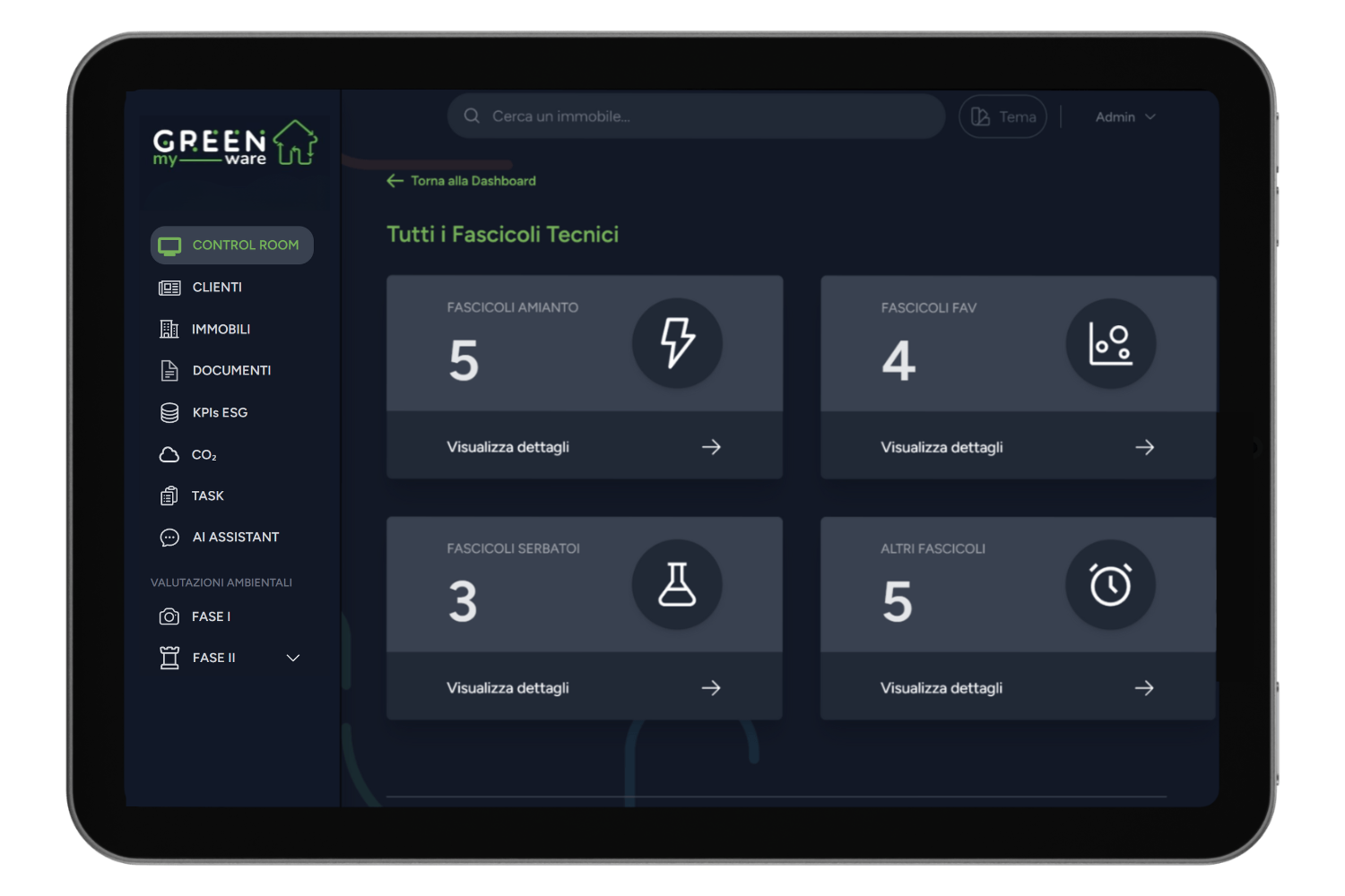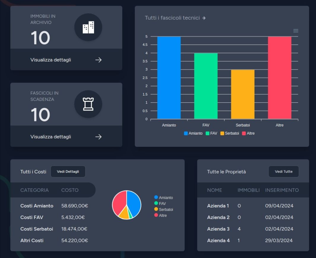 Al terzo livello della gerarchia ci sono gli Immobili che rappresentano le singole unità. Ad ogni immobile sono associati specifici fascicoli che raccolgono tutte le informazioni relative alla gestione, alla conformità ambientale ed alla performance ESG.