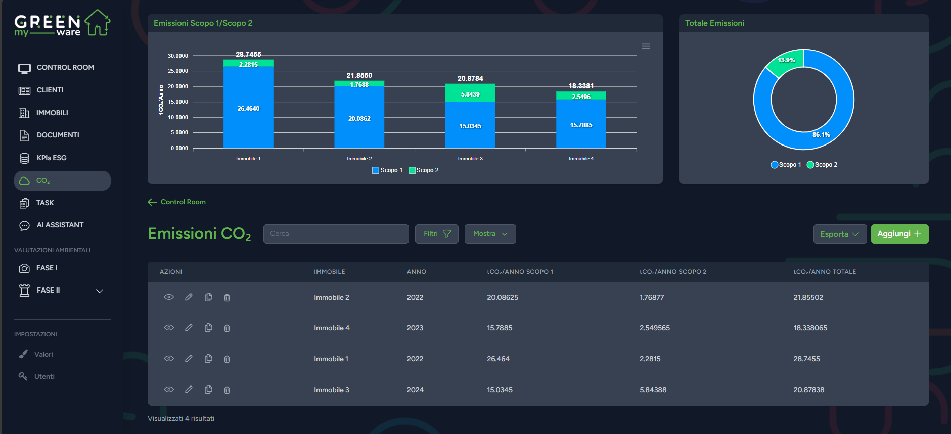 Un elemento chiave è la sezione dedicata alle emissioni di CO2, che offre strumenti avanzati per il calcolo e il monitoraggio delle emissioni di gas serra associate alle emissioni dirette (Scopo 1) e alle emissioni indirette (Scopo 2), sia per singolo immobile sia per l’intero portafoglio immobiliare.